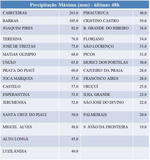 O maior volume foi registrado no município de Cabeceiras do Piauí, que liderou o ranking estadual com 263 milímetros de chuva acumulados no período, resultado de precipitações intensas e persistentes ao longo do fim de semana.